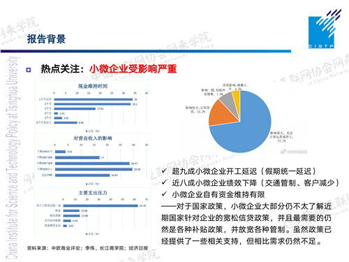 但与此同时,比较大的影响是对中小微企。这方面包括长江商学院,中欧商业评论等做过的一些调研发现,如果推迟一个月复工,实际上相当多的中小企业(1/3)是会受到影响的。目前来看,超9成的小微企业开工延迟,超8成的小微企业绩效会下降,特别是在流动资金上,如果超过3个月,可能对小微企业的影响是非常大的。