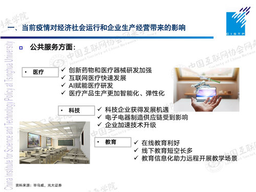 跟我们每个人密切相关的,疫情在公共服务方面所产生的影响都体现在哪里?像医疗方面,我们的创新药物的研发,互联网医疗的快速发展,在线问诊、在线买药,还有利用现代信息技术,尤其是AI技术,比如像图像识别,像腾讯的觅影,还有商汤的识别技术,可以用到快速研发、快速诊断上。医疗产品的生产,包括一些企业,用自动化的产线更加的智能化、弹性化的组织生产。在口罩的生产上,一些企业在很短的时间内开发出了自动化生产线,所以现在产能很快得到提升。