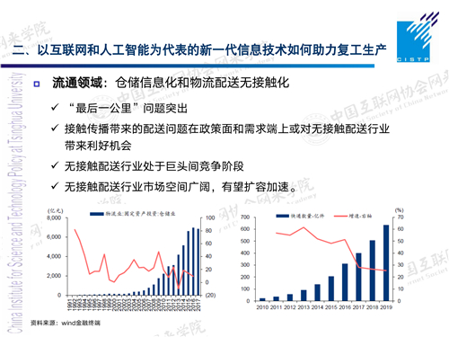 在流通领域,像我们的配送,无接触配送,快递柜,这方面在疫情之后,大家因为充分体会到了无接触配送,有它的安全、便利、卫生的优势,现在在这个市场还是在快速发展。一些大的企业,像丰巢的快递柜还有很大的发展空间,还可以跟智慧社区的建设相结合。这次因为防控的要求,大家会感觉到很不方便,不能进小区,要到门口去领快递,其实还是不能真正做到无接触,说明有这方面需求。还有像京东这样一些企业,利用机器人配送,这也是一个非常有意义的场景。在小区、办公楼也是有很大的落地空间。