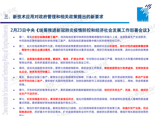在企业环节上,如何保障复工复产,尤其是强调产业链的协同,各方面的复工复产,这方面是非常重要的,对于信息技术的利用可能也是一个很重要的场景。此外还有基本的民生保障,还有外贸,产业链的畅通、供应链的畅通,这就不光是国内了,也包括国外。