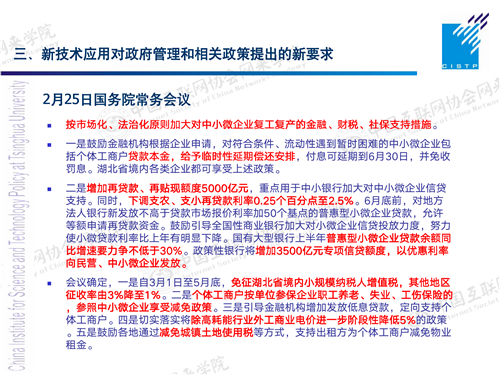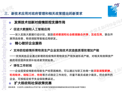 在地方的层面,不管像上海、杭州,还是北京,也出台了相应的措施,一方面是落实相关政策,再一方面是怎么发挥技术创新对疫情防控的支持作用。比如说,提出要推动大数据和人工智能的应用,特别是鼓励政府数据和社会数据的融合共享、互动和互用,这是一个非常好的理念。刚才我们讲到,利用平台企业掌握的一些数据,跟政策管理、企业的运营去结合,从而会更精准地为企业做好服务,包括我们对它的物资供应、人员的招聘。以及企业在劳动合同管理、员工管理这方面的要求,同时也采取一些更灵活的政策管理方式,减轻企业负担,保障顺利复工复产。