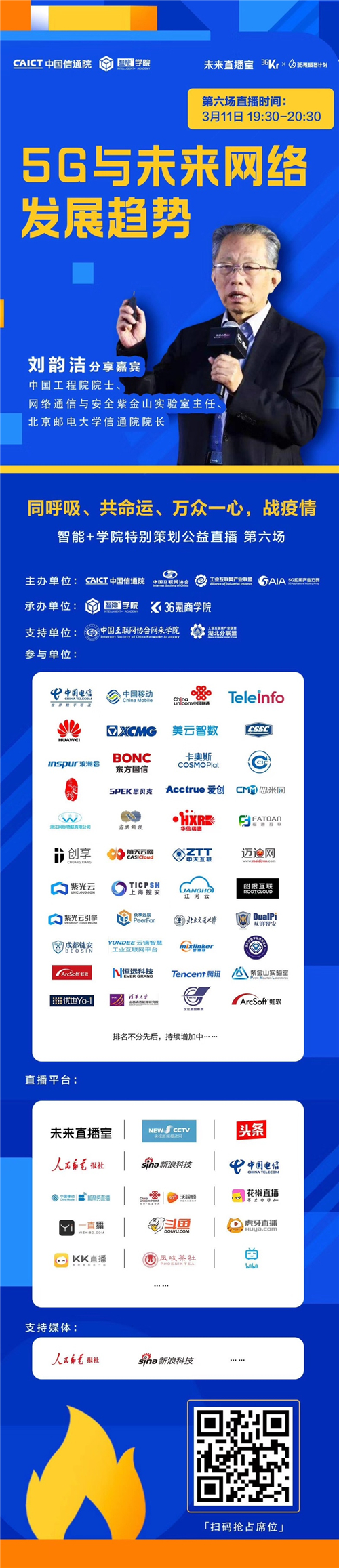 为响应国家号召,助力中小企业数字化转型升级,利用工业互联网、5G等新技术,提高经营管理水平,顺利度过难关,中国信息通信研究院联合工业和信息化部人才交流中心、工业互联网产业联盟、5G应用产业方阵共同主办了“智能+学院”特别策划——“同呼吸、共命运,万众一心,战疫情”公益直播。自2月28日起,每周三、五、日晚上19:30-20:30,“智能+学院”特别策划公益直播在20余个平台同步开启,内容重点围绕企业数字化转型、工业互联网、5G、网络标识、区块链、人工智能。中国互联网协会网来学院作为本次活动支持单位。