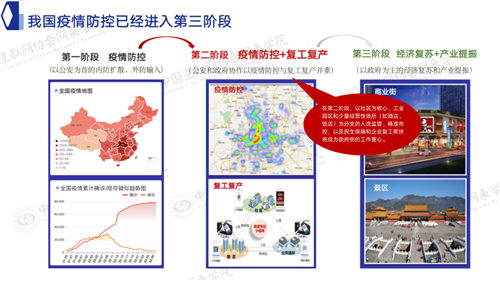 我们在三个阶段都做了哪些工作和准备。在第二阶段里更多的是以公安和政府联合配合,一方面做好复工复产,一方面做好疫情防控。为了满足这段需求,我们以社区为核心,针对社区联动周边的一些公共基础设施,像商场、写字楼、产业园区等做好疫情管控,同时帮助产业园区做好复工复产。