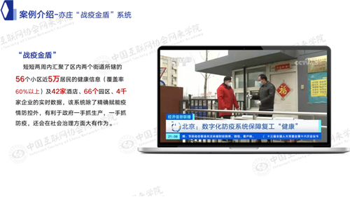 案例介绍-亦庄“战疫金盾”系统。这个工作其实在亦庄已经全面铺开,亦庄的56个社区,几万居民都在用这个系统,这是央视相关的报道。除此之外,我们在中国的33个城市,通过公益广告的形式把这种能力提供给相关的社区。