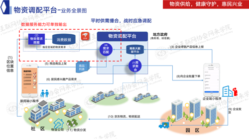 这个小程序也帮助企业和社区填报他们的诉求。比如说,我们可能在社区里面会发现老百姓有什么样的物资需求,可能会发现采购物资的时候有些货物总是买不到或者延迟送到,说明供应链可能出现了一些问题,货源不充足。另一方面,企业也可以通过这样的手段填报自己有什么样物资的滞押和有什么样的生产能力。我们通过这两方面信息的提报,可以中间利用物资调货平台做一个“撮合”的工作。社区里面需要什么,特别是在疫情阶段,疫情所压制的需求通过数据分析会挖掘出来。同时我们能掌握企业有什么样的生产能力和物资滞押,所以两方面需求撮合之后,可以通过物资调配平台,凭借京东物流的能力,把物资直接从企业和生产地拉到社区,减少中间环节,既保证了社区的民生,也给企业的生产、经济提振提高了很好的机会,这就是物资调配平台的一个大概思想。
