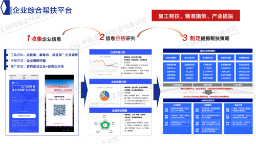 同时,我们还有一个企业帮扶平台,是为了帮助政府做到精准施策。一方面可以利用小程序收集企业在这次疫情中受到的损失和各种各样的诉求,并通过分析国家出台的各种政策去看哪些政策是对我们企业有帮扶作用。疫情过后,各个部门都出台了相应政策,有税收减免的,有五险一金延缓缴纳的,有免租金的,甚至有用工的,有帮扶的政策等等。不同行业对这些政策的敏感度是不一样的,这些政策对这些行业的有效性也是不一样的。我们通过分析政府的政策及对行业的有效性,以及考虑各个行业在本次疫情中受到的冲击程度,做好精准匹配,把政策跟行业匹配起来,在行业内部去筛选企业,最后把有限的资源提供给一些优质企业,做到合理帮扶、精准施策。整个系统由三块构成,通过疫情防控指挥平台做到市域的精准布控;通过物资调配平台做到保民生、扶生产;通过企业帮扶平台做到企业的复工复产和精准施策,这个系统其实可以在战时做到复工,平时也能做到整个城市的社会治理现代化和经济运行平台,它是一个“平战结合”的系统。