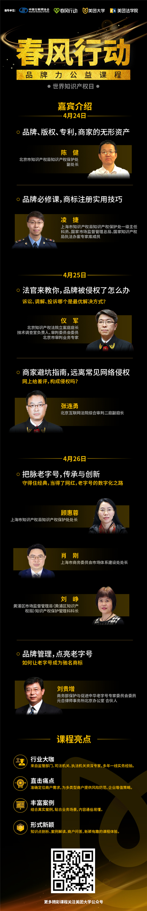 在第二十个“世界知识产权日”临近之际,为宣传推广知识产权相关法律知识,更好地保护知识产权,实现互联网创新发展,由中国互联网协会指导,美团大学法学院联合北京、上海两地知识产权相关部门,将于4月24至26日共同开展为期三天的“春风行动—品牌力”系列公益课程。