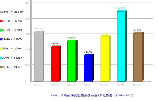 中国互联网协会反垃圾邮件综合处理平台(http://iscbl.anti-spam.cn)自正式对外开通运行之日(2007年6月18日)截至2007年9月4日上午9时,中国互联网协会反垃圾邮件综合处理平台黑名单数据已突破35万。从ISCBL实时统计报表中可以分析出,最近一周垃圾邮件数据跌涨起伏变化很大,整体呈现上升趋势,其中9月2日达到了36297次。