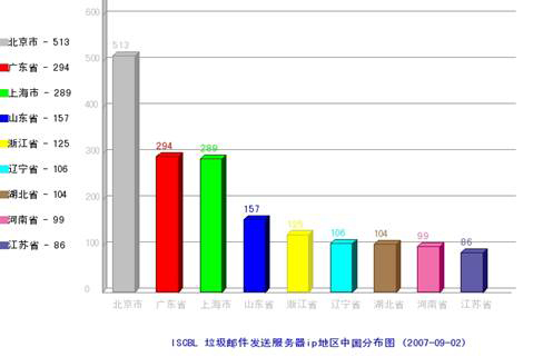 从垃圾邮件发送服务器IP地区的分布情况看,北京(513)、上海(294)、广州(280)三地仍然据前三位。